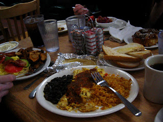 Absurdly large and heavy plates of Huevos Racheros... getting close to burning out on them at this point